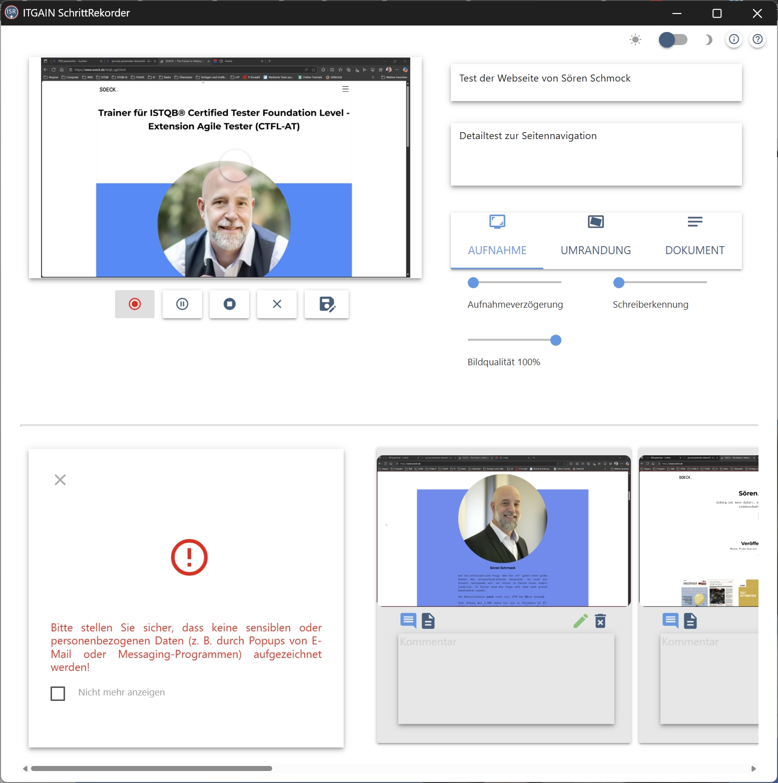 Der ITGAIN SchrittRekorder (ISR) automatisiert die Erfassung von Maus- und Tastatureingaben sowie Screenshots. Dabei entsteht eine chronologisch geordnete Abfolge von Testschritten – ergänzt um Metadaten wie Zeitstempel, Fenster-Titel und mehr.