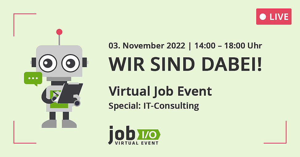 Du interessierst dich für Jobs im IT-Consulting? Dann bist du bei der job I/O am 03.11.2022 von 14:00 bis 18:00 Uhr genau richtig! Sei dabei und erfahre in der Inside-Story von unserem Kollegen Thilo Boehnke mehr über seinen Berufsalltag als Berater.