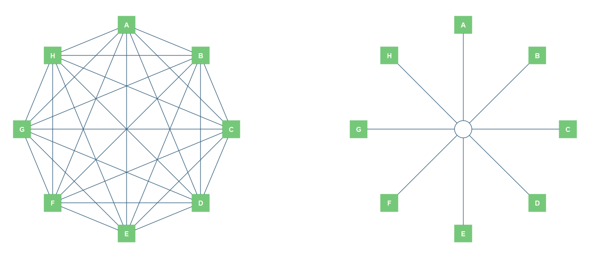 Links: Die Netzwerkteilnehmer sind direkt miteinander verbunden. Mit jedem neuen Teilnehmer steigt die Anzahl der Verbindungen im Netzwerk exponentiell.